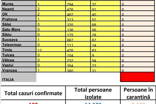 ►Persoanele carantinate instituţional se află într-unul dintre centrele din Bucureşti, Iaşi, Cluj-Napoca, Craiova, Timişoara şi Constanţa, iar situaţia pe judeţe/municipiul Bucureşti a cetăţenilor infectaţi cu virusul COVID-19 (coronavirus) se prezintă astfel: