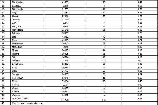 De asemenea, în ultimele 24 de ore, au fost înregistrate 19 decese (11 bărbaţi şi 8 femei), ale unor pacienţi infectaţi cu noul coronavirus, internaţi în spitalele din Bacău, Bihor, Bistriţa Năsăud, Cluj, Constanţa, Dolj, Iaşi , Maramureş, Neamţ, Olt, Suceava, Timiş şi Municipiul Bucureşti.