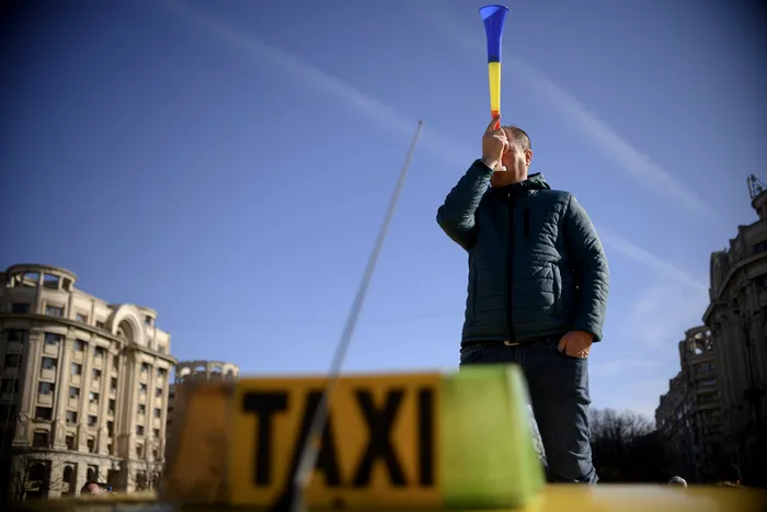 Un barbat, urcat pe o masina de taxi parcata in Piata Constitutiei, sufla intr-o goarna in timpul unui protest organizat de asociatiile operatorilor de transport in regim de taxi, in Bucuresti , miercuri, 7 februarie 2024. ALEXANDRU DOBRE/ MEDIAFAX FOTO.