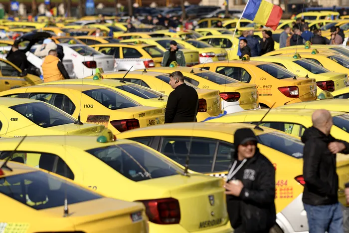 Persoane se plimba printre masini de taxi parcate in Piata Constitutiei, in timpul unui protest organizat de asociatiile operatorilor de transport in regim de taxi, in Bucuresti , miercuri, 7 februarie 2024. ALEXANDRU DOBRE/ MEDIAFAX FOTO.
