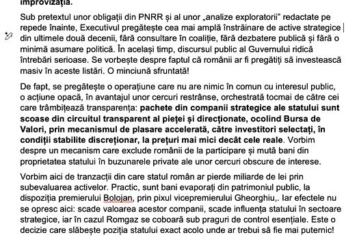 „De fapt, se pregătește o operațiune care nu are nimic în comun cu interesul public, o acțiune opacă, în avantajul unor cercuri restrânse, orchestrată tocmai de către cei care trâmbițează transparența: pachete din companii strategice ale statului sunt scoase din circuitul transparent al pieței și direcționate, ocolind Bursa de Valori, prin mecanismul de plasare accelerată, către investitori selectați, în condiții stabilite discreționar, la prețuri mai mici decât cele reale. Vorbim despre un mecanism care exclude românii de la participare și mută bani din proprietatea statului în buzunarele private ale unor cercuri obscure de interese.