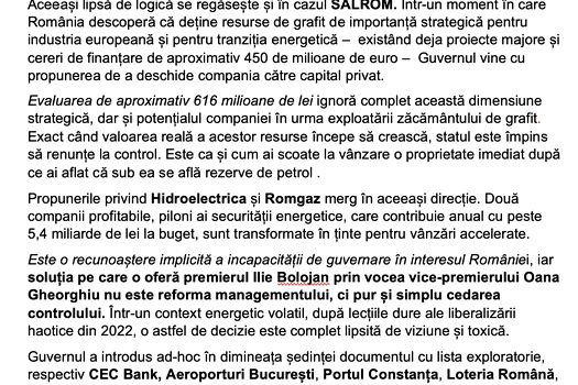 Un alt mit prin care Gheorghiu și Bolojan își justifică acțiunea este cel al instituirii bunei guvernanțe și eliminarea sinecurilor la companiile profitabile. Însă Romgaz, Hidroelectrica, Transelectrica și Transgaz sunt deja listate și au reguli de transparență și guvernanță în vigoare. Vânzarea unor pachete suplimentare nu aduce schimbări în administrare, dar reduce veniturile statului. Și este alarmantă graba cu care se încearcă vânzarea netransparentă a unor pachete consistente de acțiuni. (…) Invocarea PNRR este, după cum am arătat deja, o perdea de fum. Jaloanele nu cer vânzări rapide, ci pași concreți și planificați. Premierul Bolojan a ales însă cea mai radicală interpretare, pentru a grăbi decizii care, în mod normal, ar necesita luni de analiză și consultare. Nu există nicio obligație reală de a vinde acum. Toate aceste elemente conturează imaginea unui Executiv care nu mai guvernează în interesul României. Un guvern care acționează haotic, fără dialog și fără responsabilitate, care tratează activele statului ca pe niște bunuri dispensabile și care confundă administrarea cu înstrăinarea”, arată moțiunea.