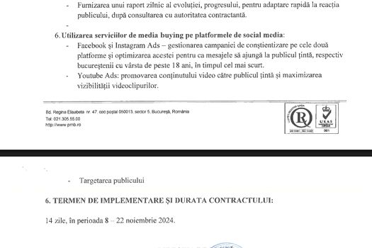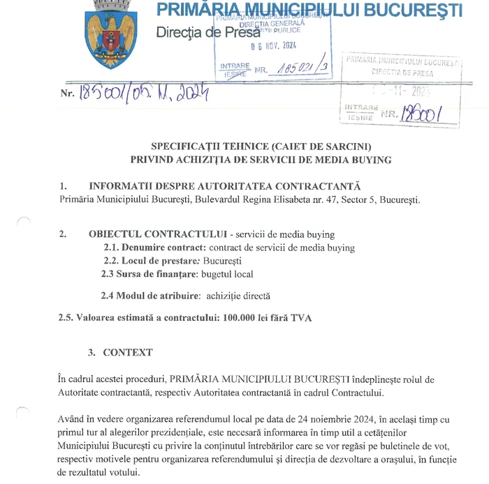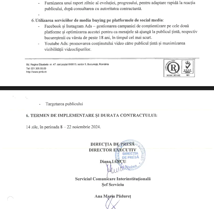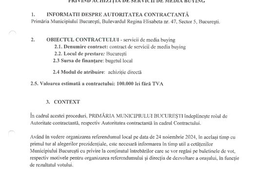 Așa se face că, Diana Iancu/ fostă Lazăr, în calitate de șef al Direcției Presă/ Director Executiv semnează pe 5 noiembrie 2024 caietul de sarcini din partea Primăriei București pentru un contract de „media buying”, cu sursă de finanțare din bugetul local, pentru 100.000 de lei fără TVA.