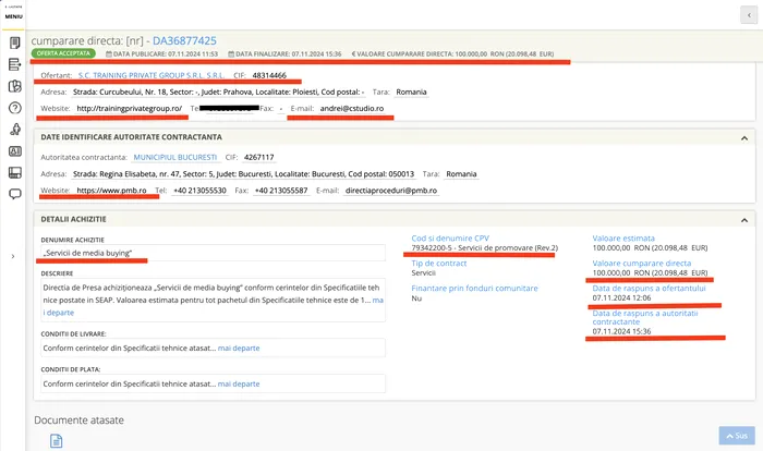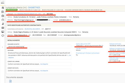 Datele SEAP arată că ofertantul, adică firma lui Andrei Bicuți ( SC Training Private Group SRL) răspunde ofertei pe 7 noiembrie 2024, la ora 12.06 iar totul este acceptat de Primărie în doar 3 ore și jumătate.