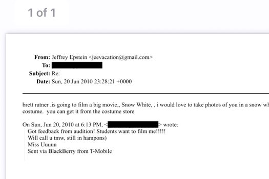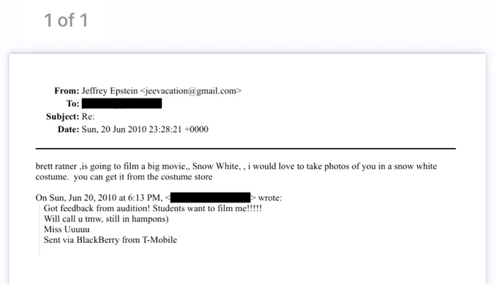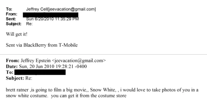 „Mi-ar plăcea foarte mult să te pozez într-un costum de Albă ca Zăpada. Îl poți cumpăra de la magazinul de costume”, i-a scris Epstein femeii pe 20 iunie 2010, conform documentelor publicate recent de Departamentul de Justiție al SUA.