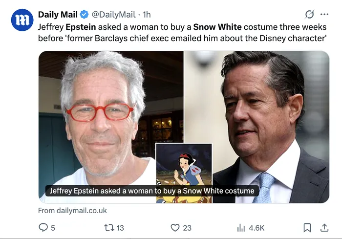 Documentele publicate de Departamentul de Justiție al SUA conțin o serie de emailuri care arată că Jeffrey Epstein, teribilul pedofil condamnat american, avea o fixație și pentru personajul Disney – Albă ca Zăpada. În scandal apare și un fost bancher de la Barclays, despre care presa britanică a mai scris că ar fi avut legături cu controversatul personaj, dar care susține că nu știe nimic despre costumația „Albă ca Zăpada”.