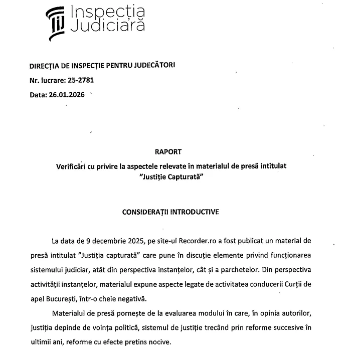 După verificări extinse, Inspecția Judiciară concluzionează – în raportul transmis CSM și consultat de Mediafax – că niciuna dintre acuzațiile prezentate în materialul jurnaliștilor nu se confirmă factual. Ba chiar filmul Recorder conține omisiuni și situații descrise selectiv și subiectiv.
