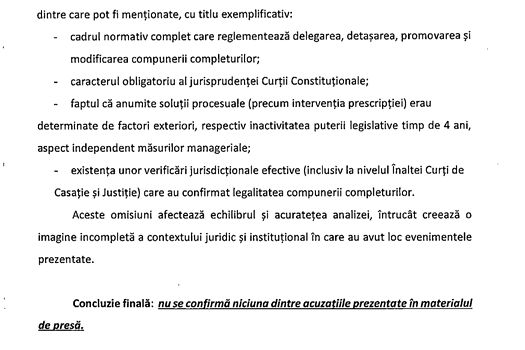 Concluzia finală a raportului magistraților Inspecției Judiciare care este prezentat Secției pentru judecători din Consiliul Superior al Magistraturii este următoarea: nu se confirmă niciuna dintre acuzațiile prezentate în materialul de presă.