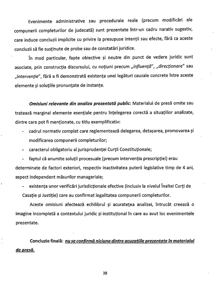 Aceste omisiuni afectează echilibrul și acuratețea analizei, întrucât creează o imagine incompletă a contextului juridic și instituțional în care au avut loc evenimentele prezentate”.