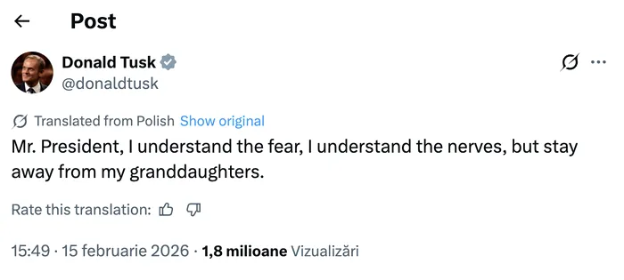În urma declarațiilor lui Nawrocki, premierul Donald Tusk a reacționat: „Domnule președinte, înțeleg frica, înțeleg nervozitatea, dar stați departe de nepoatele mele”