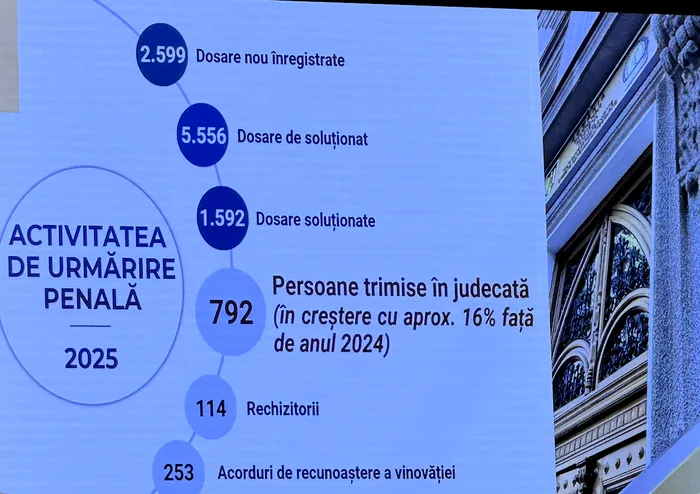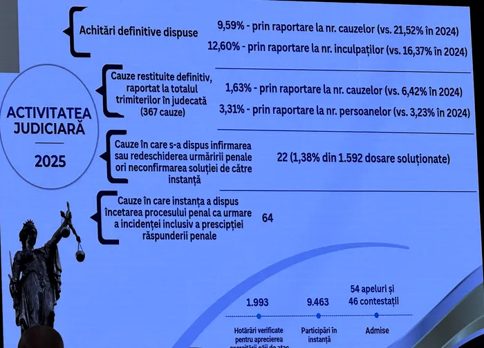 „Procentul achitărilor definitive a coborât la 9,59% raportat la cauze, față de 21,52% în anul anterior. Dosarele restituite definitiv s-au redus la doar 1,63% din totalul trimiterilor în judecată, față de 6,42% în 2024. Infirmarea sau redeschiderea urmăririi penale a fost dispusă în doar 22 de cauze, adică 1,38% din totalul dosarelor soluționate.