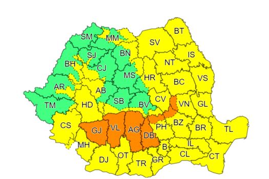 Potrivit ANM, este Cod portocaliu în judeţele Gorj, Vâlcea, Argeş, Dâmboviţa şi în zona montană a judeţelor Prahova, Buzău şi Vrancea.