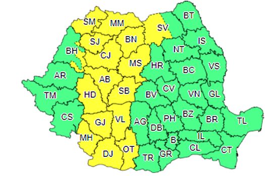 Alerta vizează judeţele Satu Mare, Maramureş, Sălaj, Bihor, Cluj, Bistriţa-Năsăud, Suceava, Mureş, Alba, Hunedoara, Sibiu, Vâlcea, Gorj, Mehedinţi, Dolj şi Olt.