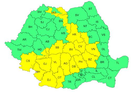Începând de miercuri, ora 14.00, până joi, ora 6.00, în Oltenia, sudul şi estul Transilvaniei, sudul Banatului, jumătatea de nord a Munteniei, sud-vestul Moldovei şi local în Maramureş vor fi perioade cu instabilitate atmosferică. Aceasta se va manifesta prin averse, intensificări de scurtă durată ale vântului (rafale în general de 55…70 km/h), vijelii, căderi de grindină şi descărcări electrice.