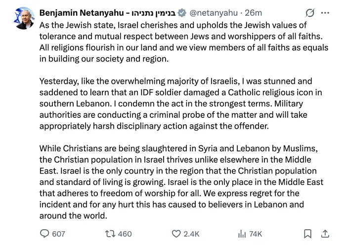 În timp ce creștinii sunt masacrați în Siria și Liban de către musulmani, populația creștină din Israel prosperă, spre deosebire de alte părți ale Orientului Mijlociu. Israelul este singura țară din regiune în care populația creștină și nivelul de trai cresc. Israelul este singurul loc din Orientul Mijlociu care respectă libertatea de cult pentru toți. Ne exprimăm regretul pentru incident și pentru orice durere pe care acest lucru a cauzat-o credincioșilor din Liban și din întreaga lume”, a scris Netanyahu.