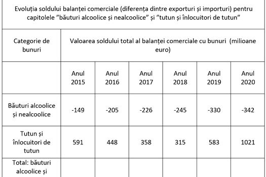 Conform datelor de la Institutul Naţional de Statistică, în primele nouă luni ale a acestui an România a exportat bunuri din categoria ”băuturi şi tutun” în valoare de peste 1 miliard de euro, reprezentând 2% din totalul exporturilor de bunuri din România în aceeaşi perioadă. Dacă, per ansamblu, balanţa comercială la comerţul cu bunuri este deficitară – diferenţa dintre exporturile şi importurile de bunuri a ajuns la 16,7 miliarde de euro în primele 9 luni din 2021- , la categoria produselor din tutun aceasta a fost excedentară.