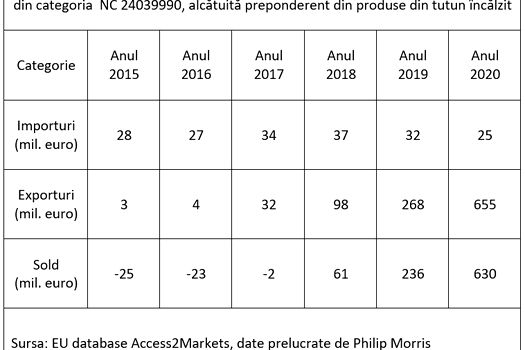 Exporturile de produse din tutun încălzit au ajuns la 655 de milioane de euro în 2020, faţă de doar 3 milioane de euro în 2015, iar surplusul generat de aceste produse a reprezentat 630 de milioane de euro anul trecut, potrivit datelor Access2Markets, portalul exportatorilor şi importatorilor al Comisiei Europene, prelucrate de Philip Morris. Creşterea este generată cu precădere de investiţiile masive în transformarea fabricilor de ţigarete de pe plan local şi reorientarea lor spre producţia de produse din tutun încălzit.