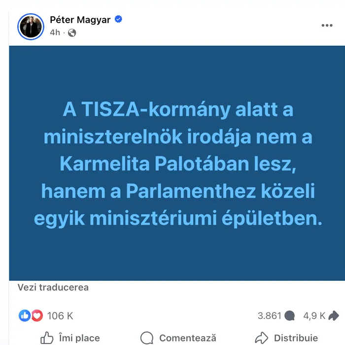 Sub guvernul TISZA, biroul prim-ministrului nu va fi în Palatul Carmelit, ci într-o clădire ministerială aproape de Parlament, a scris Péter Magyar astăzi, pe pagina sa de Facebook.