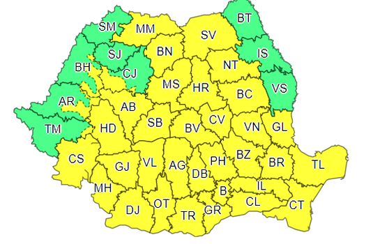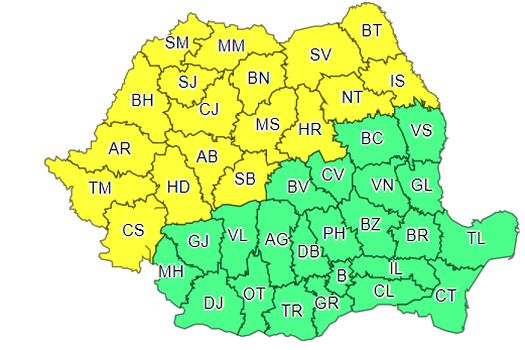 Din noaptea de sâmbătă spre duminică, de la ora 2.00, se restrânge codul galben şi rămâne valabil doar în judeţele Caraş-Severin, Timişoara, Arad, Bihor, Satu Mare, Maramureş, Sălaj, Cluj, Hunedoara, Alba, Sibiu, Mureş, Bistriţa-Năaăsud, Harghita, Suceava, Neamţ, Iaşi şi Botoşani.