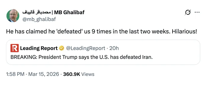 Nu este clar la care dintre cele nouă comentarii se referă Ghalibaf, dar Trump a susținut că SUA câștigă războiul cu Iranul în mai multe rânduri.