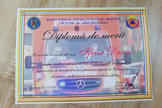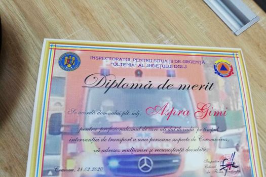Doi angajaţi ai ISU Dolj care au avut misiunea de a-l transporta, în condiţii speciale pe tânărul din Gorj, confirmat cu noul coronavirus, au fost premiaţi, vineri, de şefii, cu diplome şi aplauze.