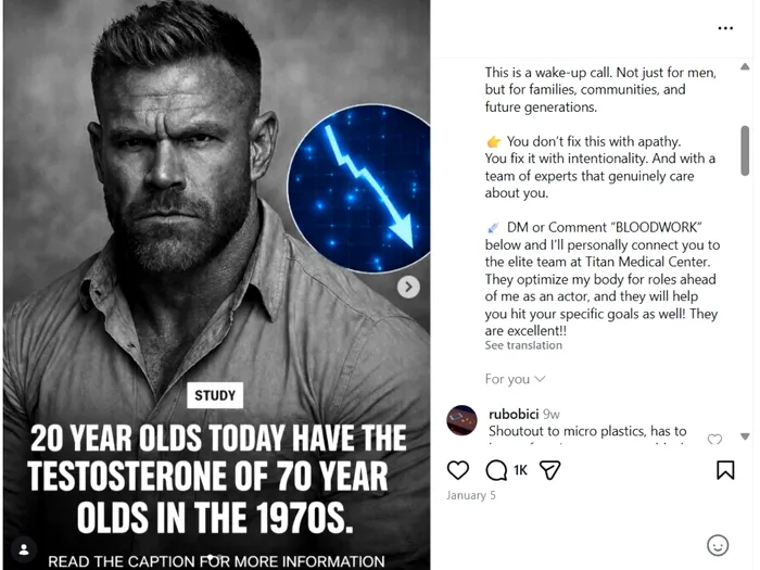 Cu ideea că „testosteronul este soluția cheie pentru a deveni un bărbat adevărat”, câțiva dintre influencerii de pe rețelele sociale îi sfătuiesc pe bărbații tineri să-și verifice nivelurile de testosteron prin teste medicale și, apoi, să cumpere produse care să stimuleze organismul să producă testosteron. Cu toate acestea, cercetătorii, dar și medicii, trag un semnal de alarmă cu privire la consumului necontrolat de medicamente ori suplimente alimentare cu testosteron.