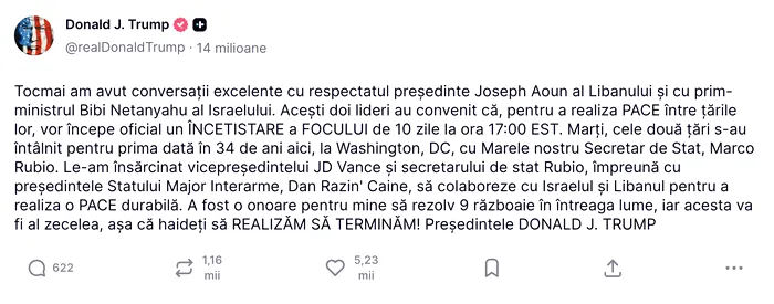 „Tocmai am avut conversații excelente cu respectatul președinte Joseph Aoun al Libanului și cu prim-ministrul Bibi Netanyahu al Israelului. Acești doi lideri au convenit că, pentru a realiza PACE între țările lor, vor începe oficial un ÎNCETARE a FOCULUI de 10 zile la ora 17:00 EST.