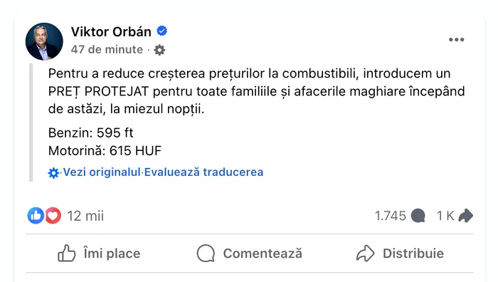 „Din păcate, ca urmare a războiului din Iran și a blocadei petroliere din Ucraina, explozia prețurilor internaționale ale petrolului a ajuns și în Ungaria. Prețurile combustibililor au început să crească brusc în toată Europa. Prin urmare, guvernul a decis în ședința de astăzi să protejeze familiile, antreprenorii și fermierii maghiari de creșterile de prețuri.